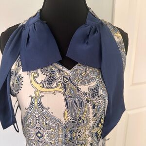 Chic maxi dress with blue and white paisley pattern. Sleeveless design. Perfect for elegant occasions.