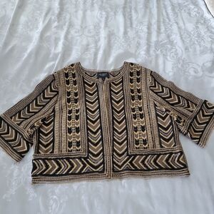 Stylish Beautiful jacket by St -John Couture, size 16 with intricate black and tan patterns. Perfect for layering and adding flair to any outfit.