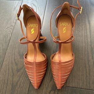 Franco Sarto Saira Ankle Strap Heels Leather Brown Size 7.5 M T-Strap Sandals