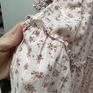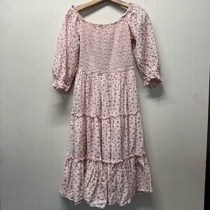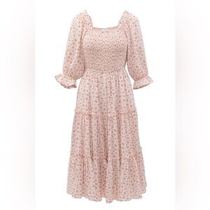 Tea length, smocked bodice, puff sleeves, micro floral print