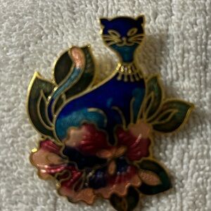 This exquisite brooch features a charming blue cat surrounded by vibrant floral accents. Perfect for cat lovers and fashion enthusiasts alike, this accessory adds a touch of elegance to any outfit. Vintage 1980s Cloisonné enamel blue cat brooch.