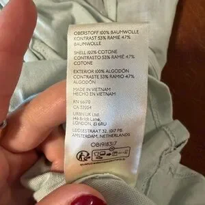 Soft sage green. Oversized puff sleeves, V-neck with button detail, gathered pleating. Flowy, relaxed fit.