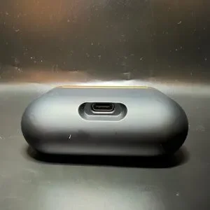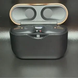Sony earbuds with a stylish black and gold design. Compact charging case included.