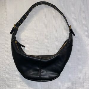 Antik Kraft black hobo bag with stylish gold accents. Top closure with two zippered compartments. Features a comfortable strap with grommet details. Excellent used condition.