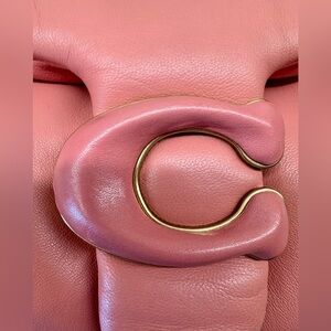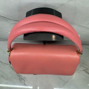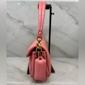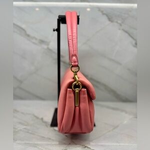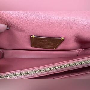 Elegant Coach shoulder bag in a soft pink hue. Features a stylish flap closure with signature hardware. Perfect for any occasion.