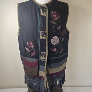 Parsley and Sage sleeveless vest, 100% wool, size Large. This is truly a wearable art piece with floral embroidery, fringe at the hem, and individual layer details. Single pocket in the front, oversized wood-look buttons. Fully lined.