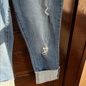 Stylish cropped jeans with distressed details. Rolled cuffs for a casual look. Perfect for everyday wear.