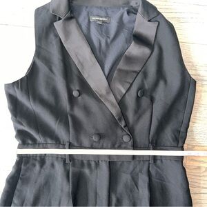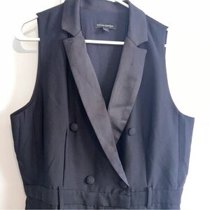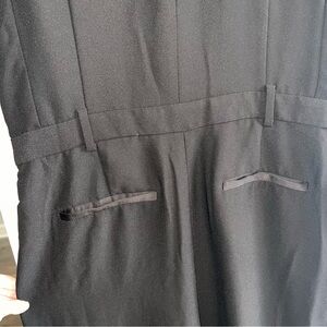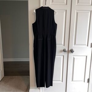 Chic black jumpsuit with a double-breasted front. Sleeveless design for versatile styling.