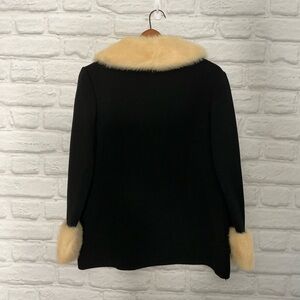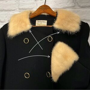 Crafted from 100% lightly ribbed wool and featuring genuine fur trim (most likely blonde mink) at the collar and cuffs, this double-breasted coat showcases gold-tone metal and cloth buttons and mid-century tailoring. The soft fur and structured silhouette evoke the refined mod style of the era. Beautifully preserved. See images for measurements and detail shots showing fur trim, jigger button or in this case snaps that run down the front underneath the double breasted flap, and a close up of the fur.