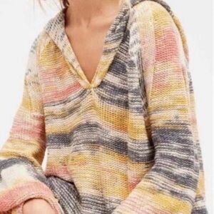 This adorable Free People Snowcone Hoodie Sweater from Revolve is in the gold Combo color which is gold , cream, grey and peach. It has a v-neck, a hood, side tie details and a kangaroo pocket.