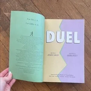 Duel book featuring an illustrated cover with vibrant colors. Sold as is see photos
