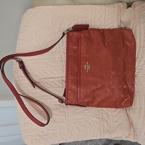 Coach Signature Shoulder Bag in True Red in new-like condition. The red looks more like a dark red/rust color to me. Either way, it's a beautiful bag and color. The exterior and interior are very clean. Has an adjustable strap.