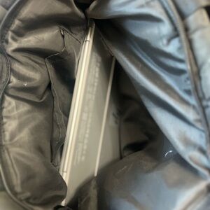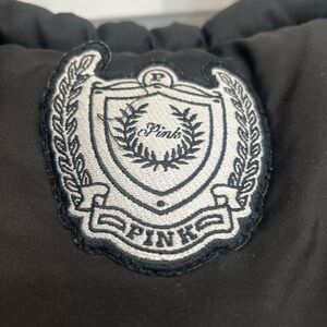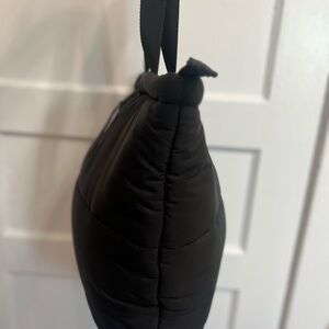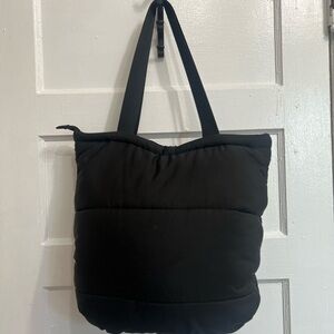 Chic black puffer tote with logo detail. Ideal for daily essentials.