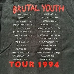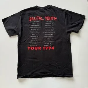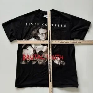 vintage. hanes tag. size large. fits short at waist. see photos for measurements. model is 5'10" 157 lbs for reference. single stitch. made in usa. 100% cotton. black. elvis Costello brutal youth tour 1994 shirt. authentic concert tee