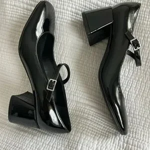 Elegant black patent leather heels with a chic buckle strap. Perfect for any occasion.