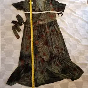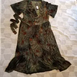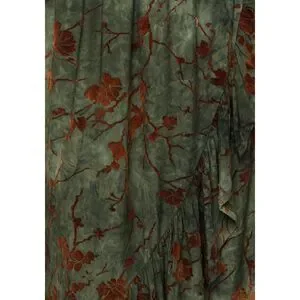 - Green ruffled midaxi wrap dress with orange-brown velour flocking