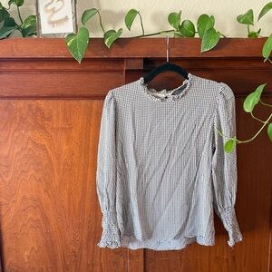 Chic checkered blouse with ruffled collar. Long sleeves with gathered cuffs. Perfect for versatile styling. Slight put staining, see photos.