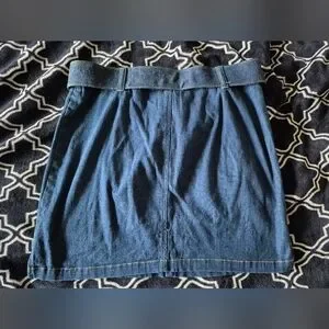 "Randall and Jordan skirt. dark wash 16" length size 6 and very stretchy. It is possible it could fit up to a size 8 but I can't test that theory for you 😅. Most likely a juniors size.