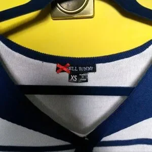 Nautical-inspired knit top with blue and white stripes. Features a sailor collar and tie detail. Short sleeves with ribbed cuffs. Like new condition. Tried on only.