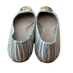 Tory Burch Reva Stripe Ballet Flat Beige Blue Snakeskin Size 8