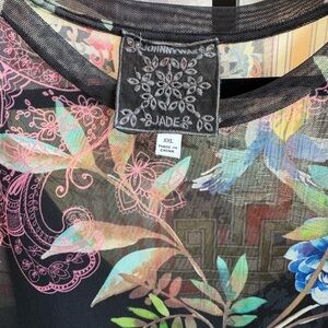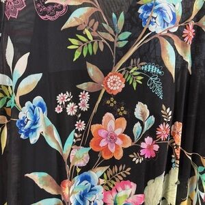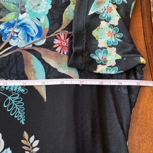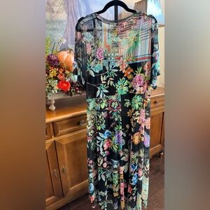 Elegant black midi dress with vibrant floral patterns. Features short sleeves and a flowing silhouette. Perfect for any occasion.