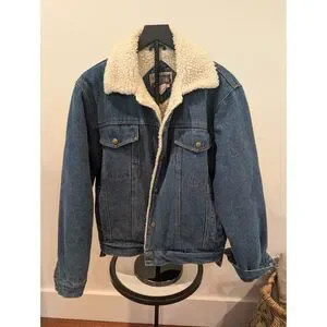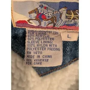 Rugged western-style denim jacket from Diamond Double U, featuring a plush white sherpa lining and embroidered cowboy patch. Built for warmth and durability, this size L jacket blends classic blue denim with smooth nylon-lined sleeves for easy layering. Ideal for cold-weather wear, ranch-inspired styling, or collectors of vintage Americana.