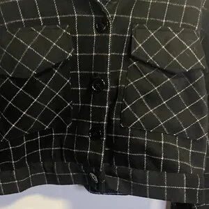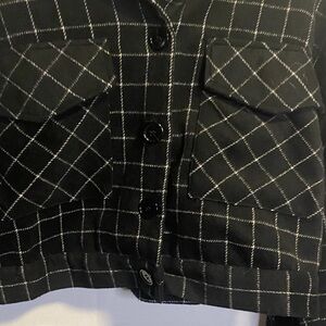 Chic black checkered blazer. Cropped design with front pockets. Ideal for stylish layering.