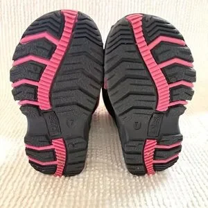 Cozy waterproof winter boots for girls with warm lining, durable tread soles, and easy velcro closure. Black and pink design. Gently worn, excellent condition. Perfect for snow, rain, or cold weather.