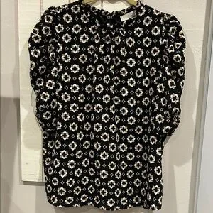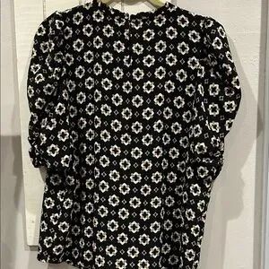 Stylish geometric fully lined blouse with puff sleeves. Black base with cream and gold accents. Perfect for versatile wear. Offers button keyhole close on back. PTP 22” length 25” Bundle and Save!