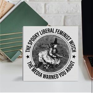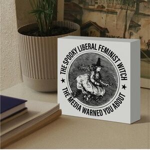 Wooden art accent piece in white with black print: “The spooky liberal feminist witch the media warned you about” and a cute witch design. Perfect for adding a unique touch to your space. Great gift idea.