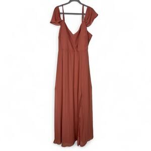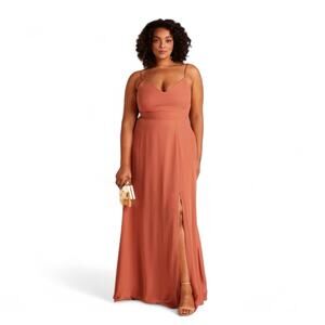 Elegant terracotta maxi dress. Spaghetti straps. Front slit detail. Perfect for special occasions.