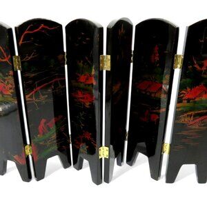 Geisha Mini FOLDING SCREEN Black Lacquer 6 Panel Asian Women Vintage