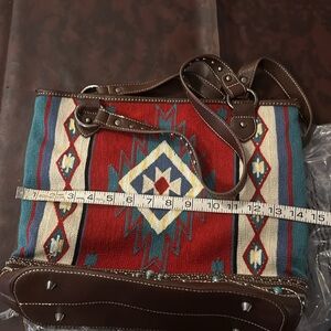 Preowned. Tapestry front. Embellishments along bottom. Zipper compartment in back. Main compartment zips. Inside center zipper. Also hidden side zipper pocket inside. Various other pockets. 14 1/2 inches wide 12 inches deep. Strap drop is 10”