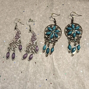 2-Pair Elegant Earring Set – Simulated Amethyst Peacock Design & Simulated Turquoise Tassel Style (2 ¼ Inch Length)