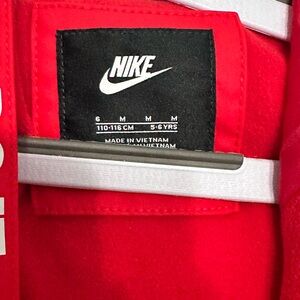 Bright red Nike kids’ rain/repel jacket, size 6 (fits approx. 5-6 years / 110-116 cm). Features full-zip front, hood, “Just Do It.” branding on the zipper placket, snap-closure side pockets, elastic cuffs and water-repellent shell.