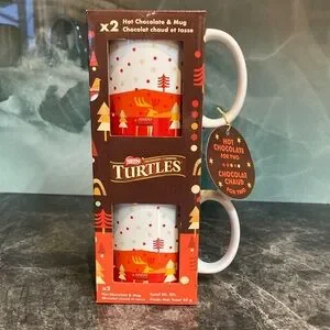 Enjoy your favorite holiday beverages with these charming red and white reindeer mugs. Perfect for adding a festive touch to your home dining experience. 2 New Mugs in box. (No Hot Chocolate powder included.) Just add turtles hot chocolate powder for instant gift! 🎁
