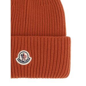:MONCLER orange wool and cashmere logo beanie featuring brioche stitch work and logo patch.