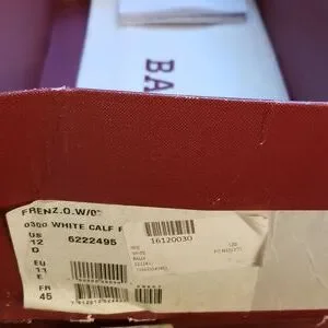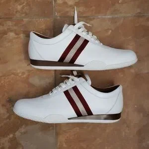 Stylish Bally sneakers. Black and white leather design. Red and gold accents. Perfect for casual wear.