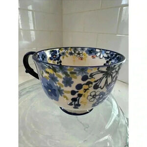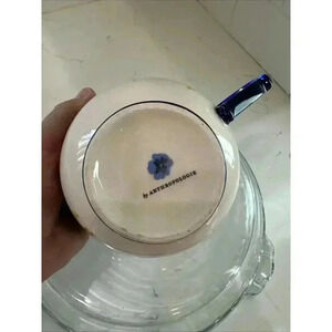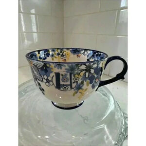This Anthropologie tea/coffee mug features a beautiful floral design with a monogrammed 'H'. The round ceramic mug is perfect for any occasion and holds up to 11 oz. It's a great addition to your collection of contemporary style mugs, with a blue color and a food & drink theme. The mug is personalized and makes a great gift for someone special. The set includes a coffee mug and is perfect for tea lovers or coffee enthusiasts.