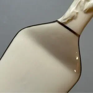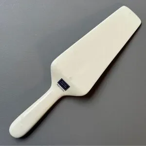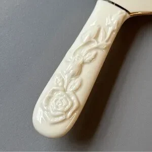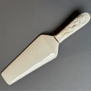 Beautiful ivory porcelain cake server by Royal Limited, featuring an embossed rose detail on the handle. A lovely addition to your table setting or vintage kitchenware collection.