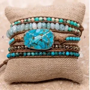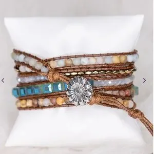 Long, thin tan vegan leather strand that wraps around wrist multiple times. In addition, a large turquoise stone charm with with natural stones/beads and bronze sunflower closure.