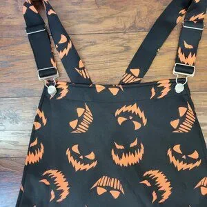 For sale is a pair of shortalls from Hot Topic. They are in new condition with tags attached. Look scary cute this Halloween season with these scuba shortalls, featuring sinister jack-o'-lantern faces all over. Comes with pockets, belt loops at the waist, adjustable overall straps, and has a zipper and hook on the right side of the shorts for entry. Great for a quick Halloween costume, or as a casual piece for anyone who thinks everyday is Halloween. Size 3, approximate measurements: length from top of apron to bottom hem- 30", waist- 50", hips- 58", inseam- 4.5", leg opening laying flat- 18".
