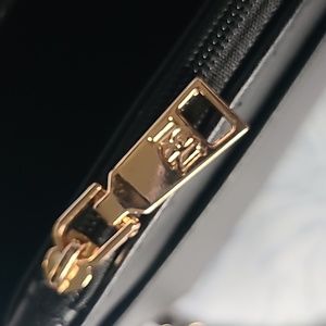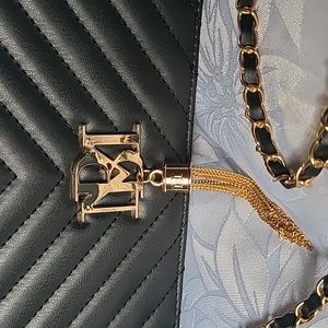 Chic black crossbody bag with elegant gold chain. Features signature logo detail. Perfect for stylish outings.