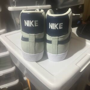 Sleek Nike high-tops with a light green upper and dark blue accents. Perfect for athletic wear.