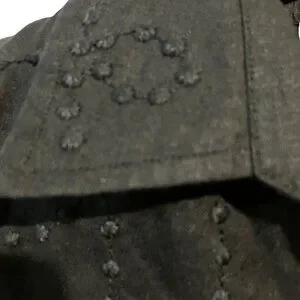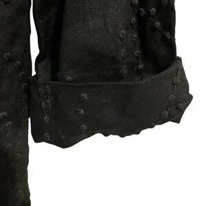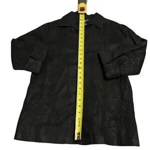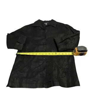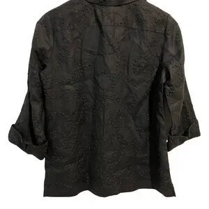Elegant black button-up shirt by Jones New York Signature, crafted from 100% linen with a subtle raised textured dot pattern forming delicate swirls throughout. Features 3/4 sleeves with cuffs, a classic collar, and a comfortable relaxed fit ideal for work or casual wear. Lightweight and breathable fabric, perfect for any season.