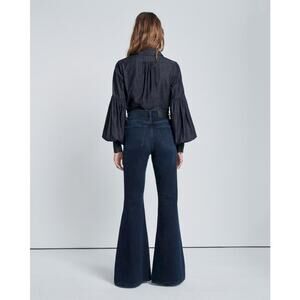 These ultra high-rise fashion jean makes an impression. With its 70s-inspired silhouette and medium stretch fabrication, this showstopper is done in an elevated dark wash with whiskering. Fitted through the hips and thighs, its elongating leg leads to a bold flare.