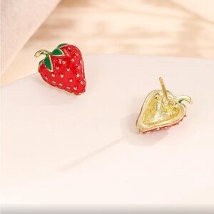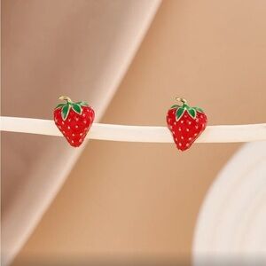 Charming strawberry shaped earrings with vibrant red and green colors. Perfect for adding a playful touch to any outfit.
