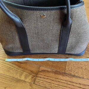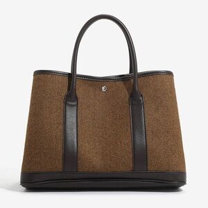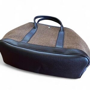 Stylish and durable tote bag made with a textile herringbone-style fabric and faux leather trim/handles. Roomy enough for daily essentials, laptop, or as a chic work/travel bag. Versatile neutral tones make it easy to pair with many outfits.