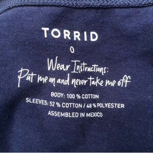 Torrid Women’s Size 0 or size Large. Raglan sleeves top. Navy blue with Gray Sleeves. Curved hemline. Vinyl lettering: EYE ROLLING MYSELF INTO ANOTHER UNIVERSE Excellent Condition. Measurements laying flat chest 23 neck to hemline 26.Material 52% cotton 48% polyester.