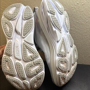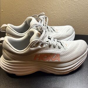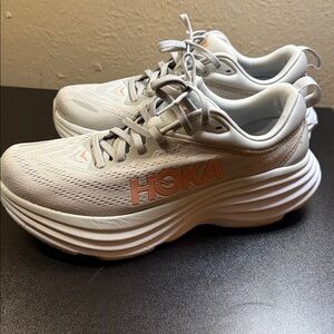 Hoka sneakers featuring a gray base with orange highlights. Ideal for active wear. No box , no damages no bad smells. used only for walks